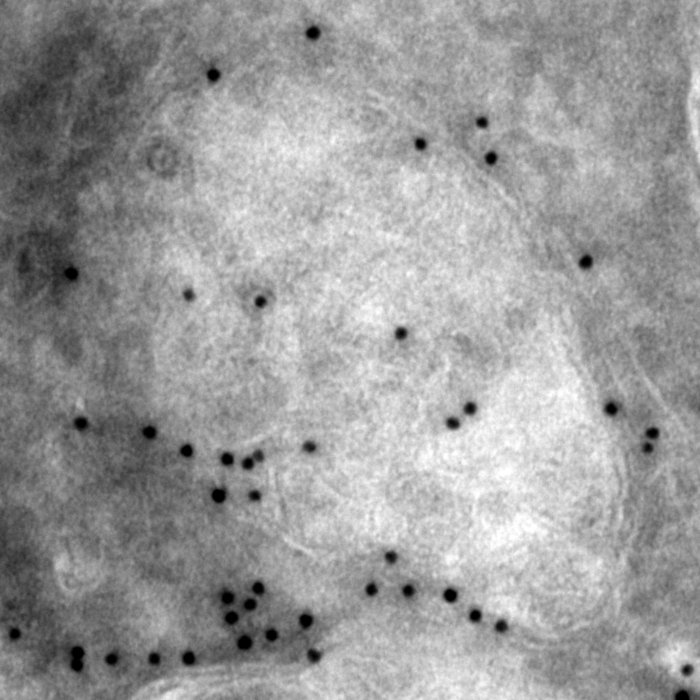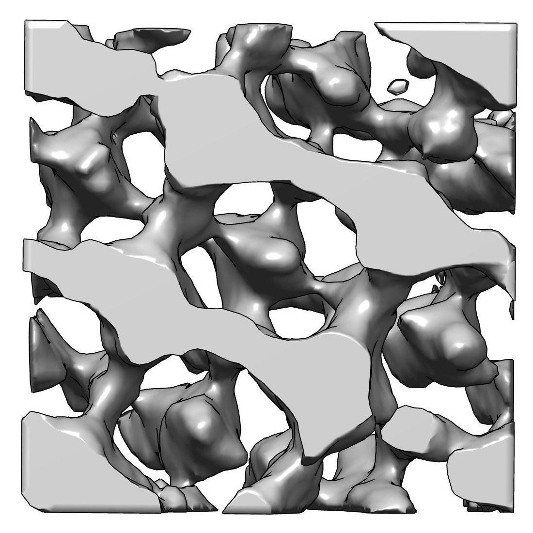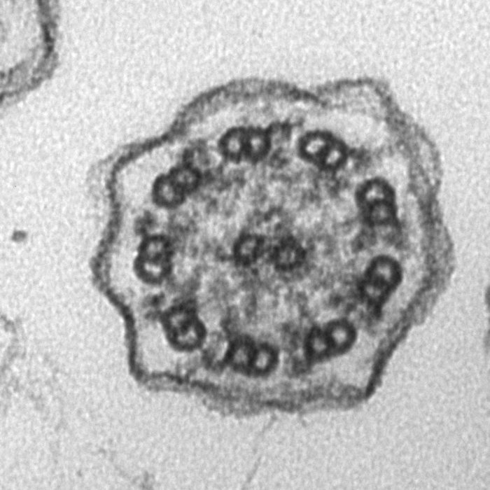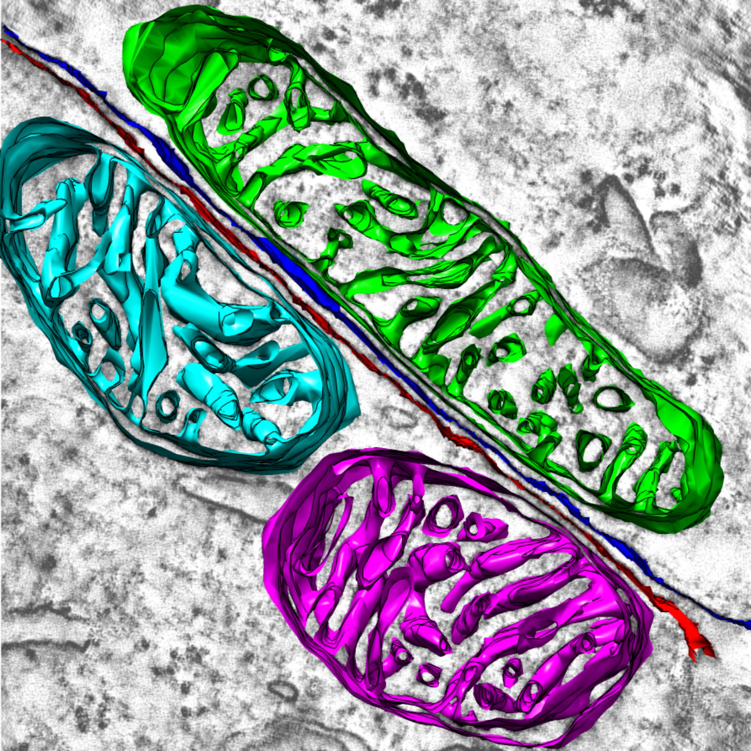 A slice from an electron tomogram that includes an overlay of a model showing the structure of the discs in the light detecting outer segment region of a rod photoreceptor. These disc structures are replaced on a daily basis from evaginations of the plasma membrane (shown in green).